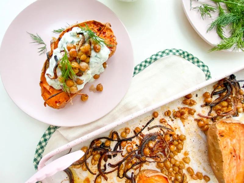 This recipe is a fun and healthy take on a classic baked potato. Yams are loaded with vitamins, the crispy chickpeas are a vegetarian alternative to bacon and the tzatziki is a fresh take on sour cream.